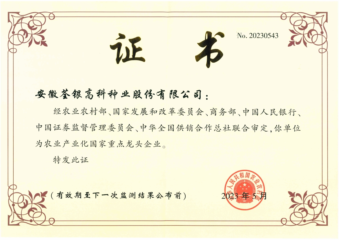安徽荃銀高科種業(yè)股份有限公司是一家“以種業(yè)為核心、農(nóng)業(yè)服務(wù)為延伸、探索和創(chuàng)新農(nóng)業(yè)多元化發(fā)展”的現(xiàn)代高科技種業(yè)上市公司,證券代碼:300087。公司注冊資金9.47億元,系“中國種業(yè)領(lǐng)軍企業(yè)、農(nóng)業(yè)產(chǎn)業(yè)化國家重點龍頭企業(yè)、國家高新技術(shù)企業(yè)、農(nóng)業(yè)部首批農(nóng)作物種子育繁推一體化企業(yè)、中國種業(yè)信用明星企業(yè)"。在國內(nèi)控股子公司20多家,在國外設(shè)立分支機構(gòu)4家,良種銷售至全國20多個?。ㄊ小^(qū)),出口覆蓋20多個國家與地區(qū),種業(yè)綜合實力、雜交水稻研發(fā)、推廣及海外業(yè)務(wù)規(guī)模均居全國種子企業(yè)前2位。